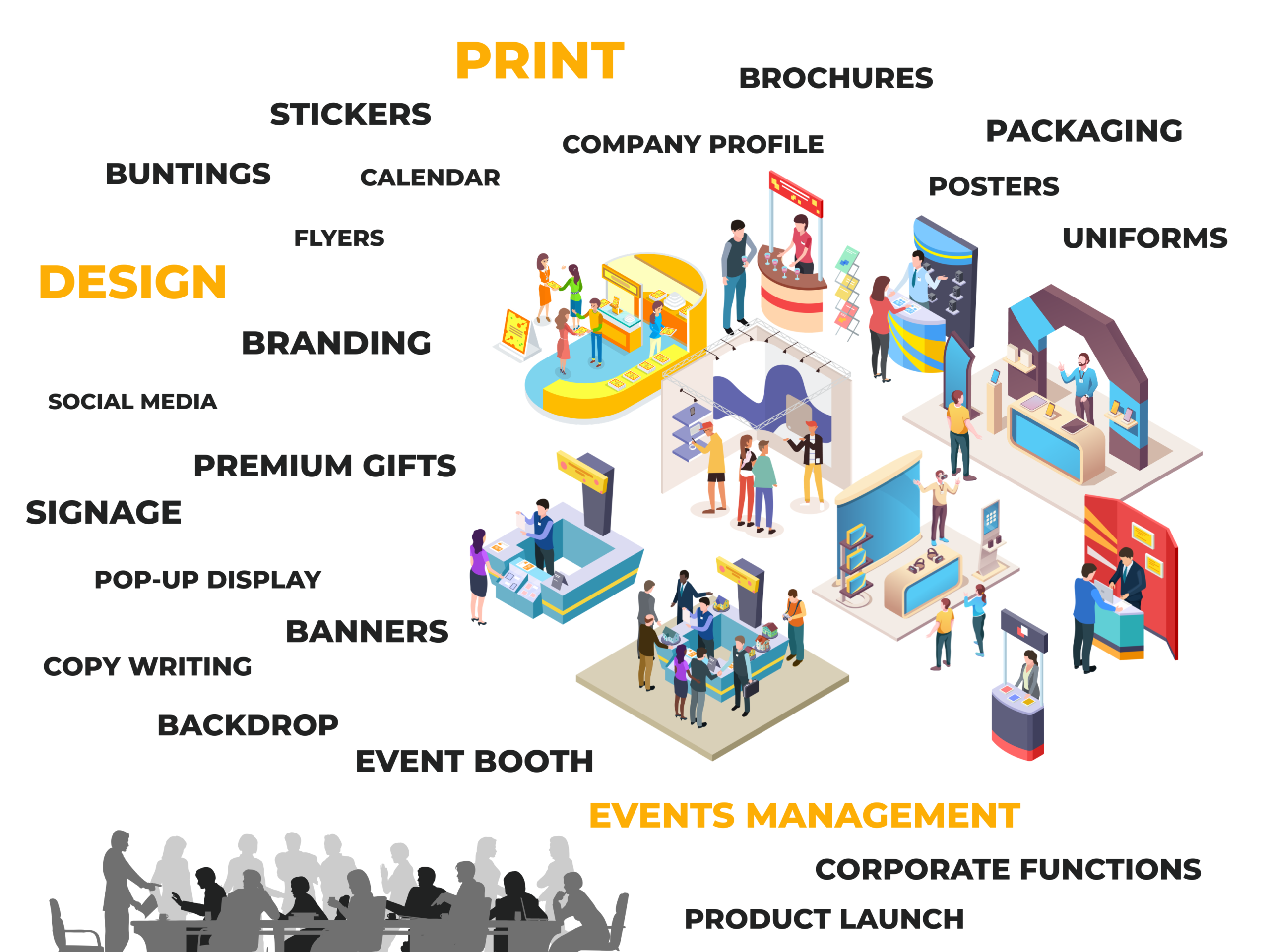 One-Stop Solutions Our Services Creative Design Focus on how you can help and benefit your user. Use simple words so that you don't confuse people. Events Management Focus on how you can help and benefit your user. Use simple words so that you don't confuse people. Professional Print Focus on how you can help and benefit your user. Use simple words so that you don't confuse people. WHY US We are your one-stop hub for creative design, event management and professional print. From concept to execution, we ensure smooth project delivery and outstanding results.We collaborate closely with clients to deliver impactful, cost-effective outcomes – every time. QUESTIONS? Seeking for a one-stop solutions,we’re here to answer any questions.Immediate response is our commitment.